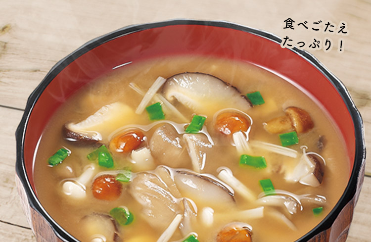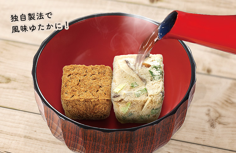 新鮮なおいしさを楽しめるよう、製法にひと工夫を加えま した。お湯をかけるだけで作り立ての味わいが広がります。 おみそ汁とお吸い物、お好きなものを召し上がれ。