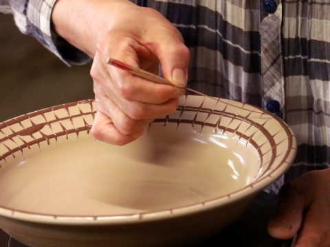 ”スリップ”と呼ばれる化粧土で模様を描く”スリップウェア”のうつわが特徴です。