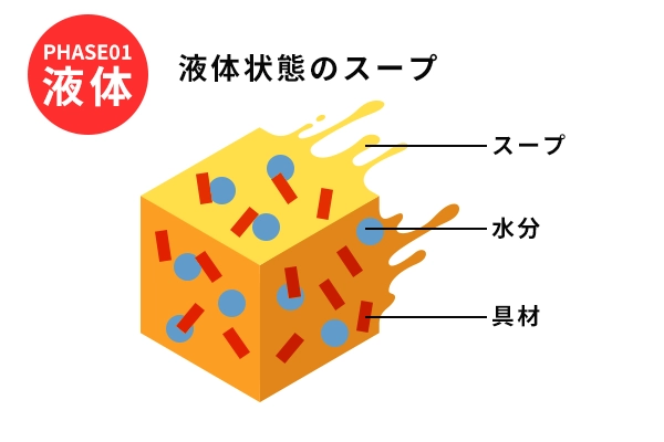 フリーズドライのメカニズムでも触れたように、製造工程で水分を氷にした状態で昇華させるため、氷があった場所が空間として多く残っています。お湯を注ぐとこの空間にサーっと水分が入るため、素早く簡単に元の状態に戻ることができるのです。