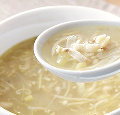 高知県産の生姜ペーストだけでなく、生姜の千切りを使用することでシャキシャキ食感を味わうことができます。 生姜の香りと辛味だけでなく食感も味わうことができるうれしいスープに仕上げました。 鶏肉と千切り生姜だけでなく、国産白ねぎもたっぷり使っています。 これらの具材をしっかり炒めることでスープにコクと旨みがさらにプラスされ、ボリュームたっぷりのスープが完成します。