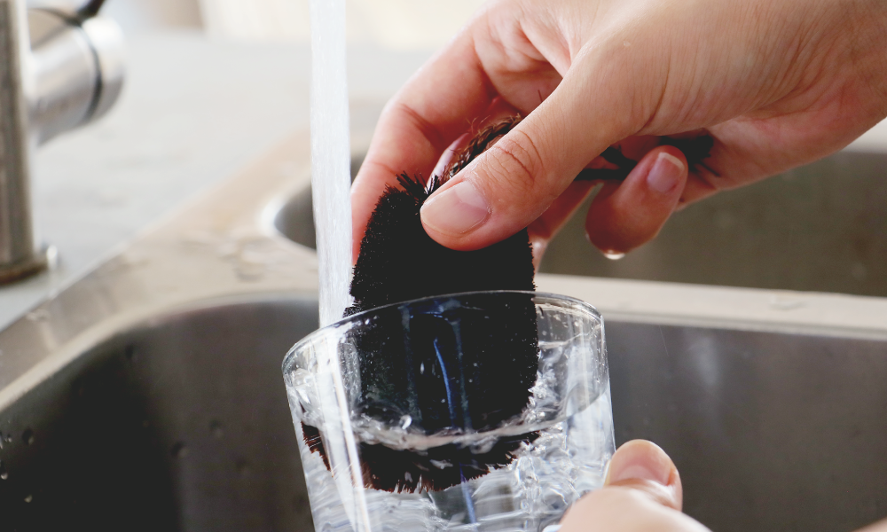 キッチンで、ガラスのコップや焦げつき防止加工済みの