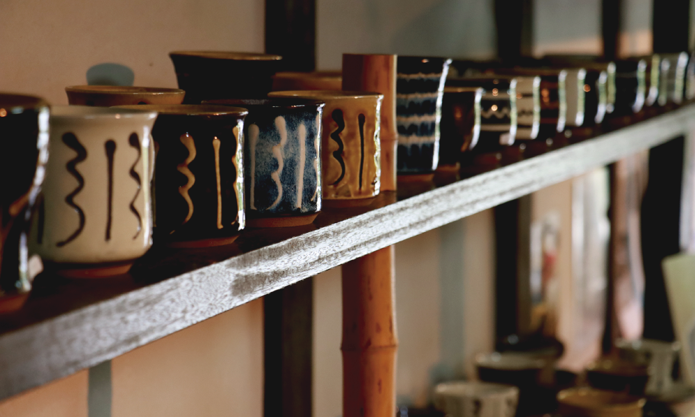 日本の昔ながらの建物の中に並ぶたくさんのうつわたち