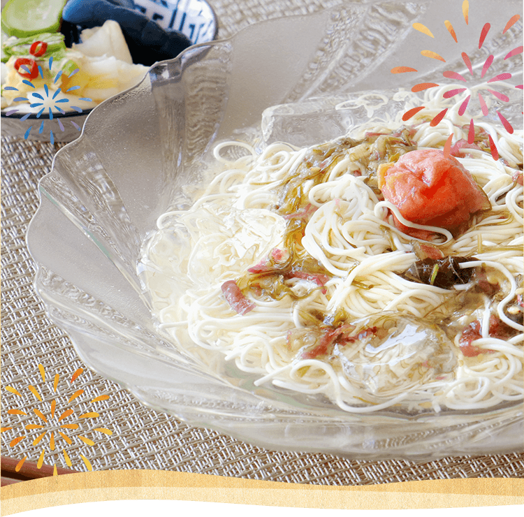 梅のお吸い物を冷水140mlで戻し、水気をよく切った素麺を入れて混ぜる