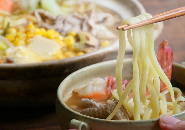 最後の〆はおじやかうどんをぜひ!シャキシャキとした生姜の食感と風味がしっかりきいた鍋つゆに溶き卵を加えてまろやかさを足したり、柚子胡椒を入れてピリッと感を味わうのもおすすめです。