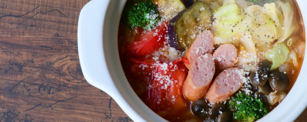 具材がたっぷり入ったミネストローネにウィンナーや豚肉、ブロッコリーやなす、キャベツを加えて、野菜たっぷり「洋風鍋」を作りました。