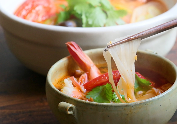 ハーブとスパイスの柑橘系の香りが際立つトムヤムクンにはフォーを入れて、パクチーをたっぷりトッピングすると、さらにエスニックな味わいが引き立ちます。
