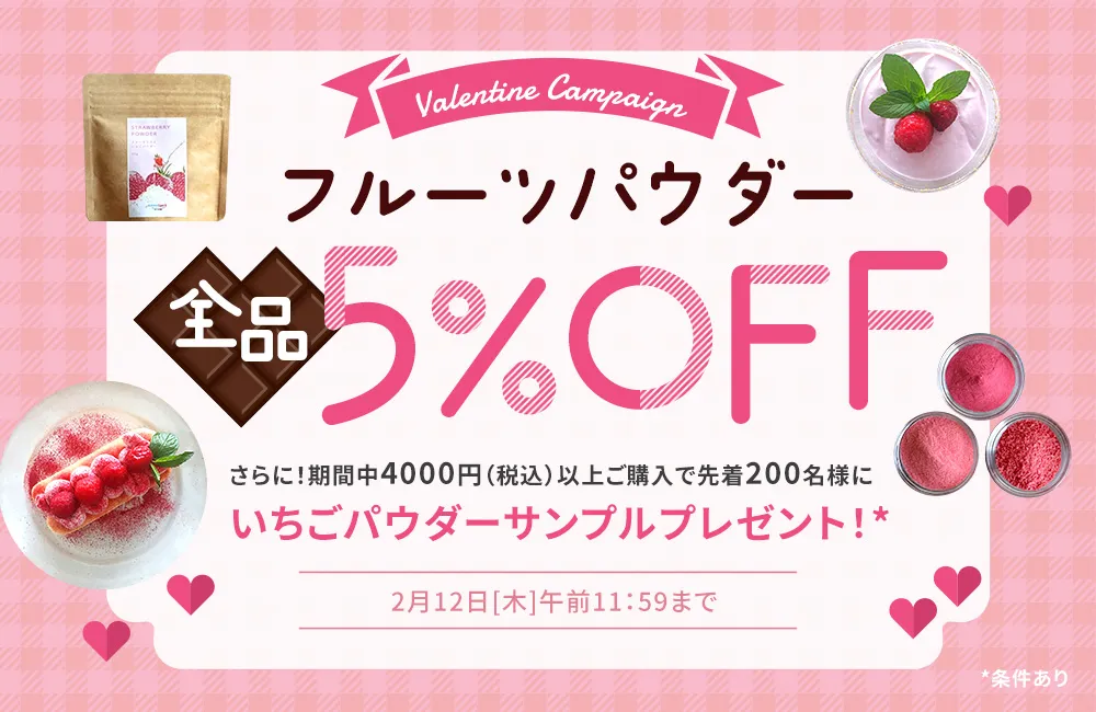 2026/01/15 【バレンタインキャンペーン】フルーツパウダーが5%OFF、さらに先着で「いちごパウダーサンプル」プレゼント!